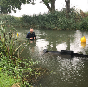 Above Left: Kees te Velde, a SATURN PhD-student at Leiden University wades in a wetsuit to place Soundtrap recording equipment for underwater soundscape sampling of migratory fish. Above right: Pilot recording locations in the Rhine.